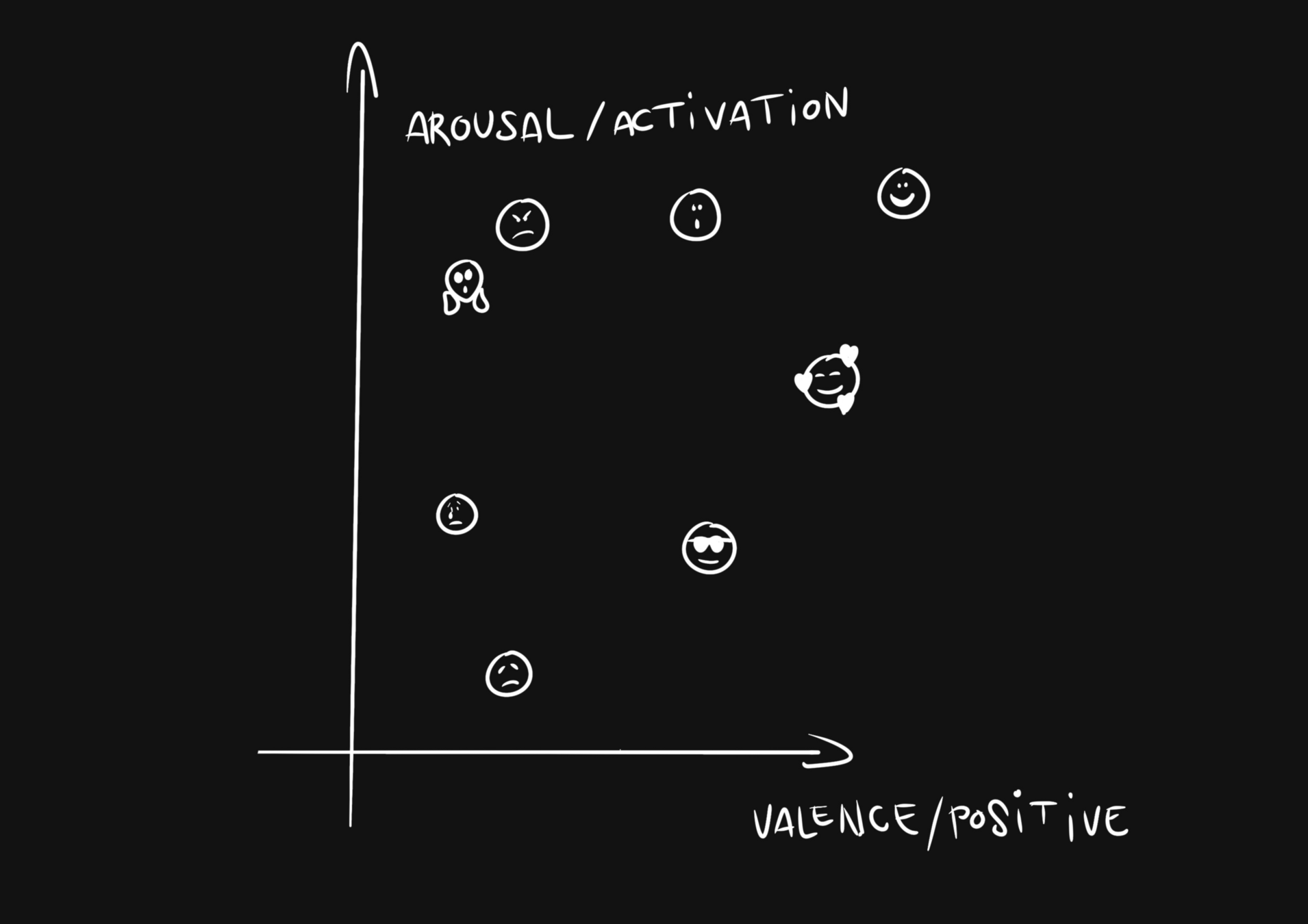 Valence (positive ↔ negative) and Arousal (intensity ↔ calm) are the two emotional axes we will later map onto our EEG readings.