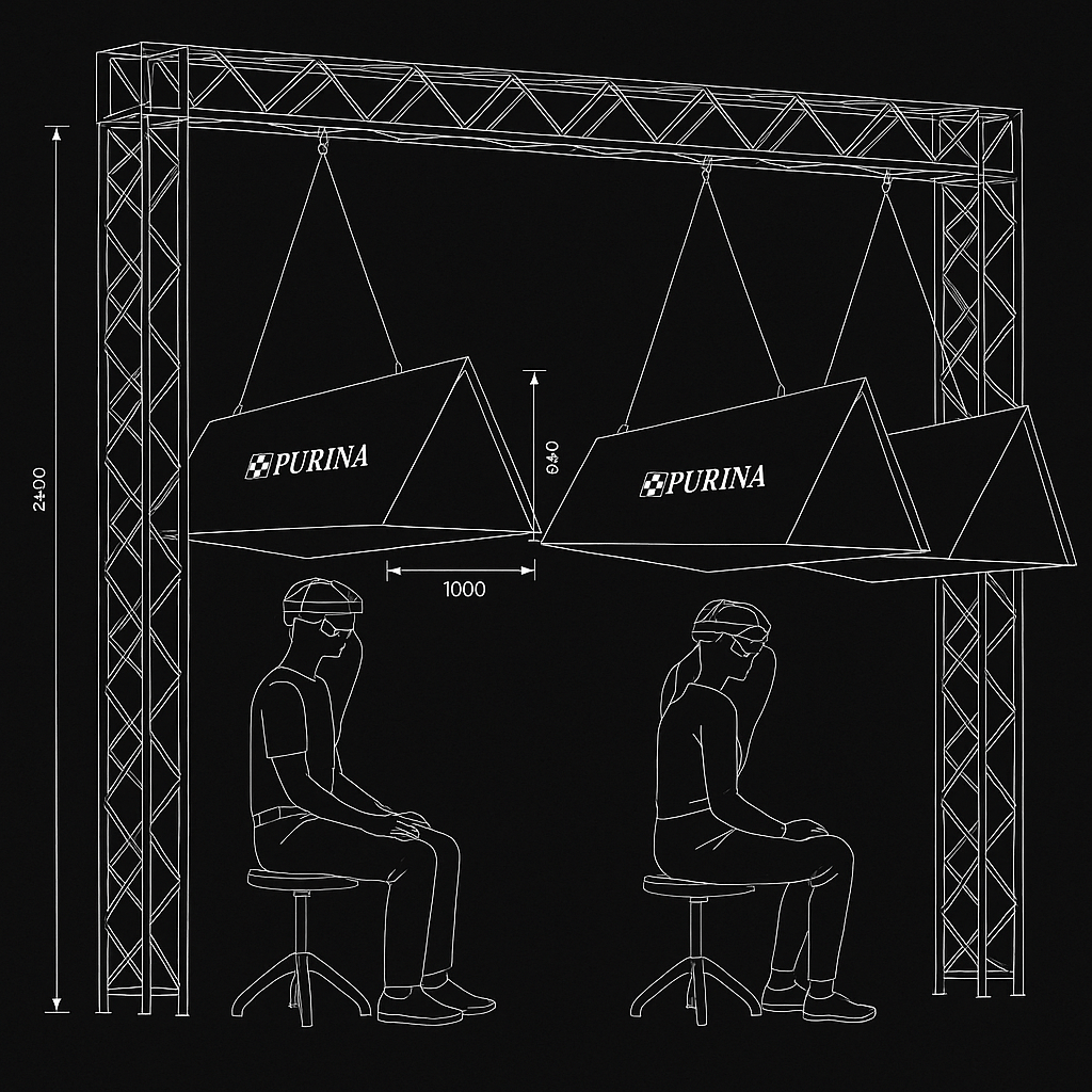 The installation is built around a suspended triangular kaleidoscope pod, clearly identifiable as a prism inspired by the classic kaleidoscope form. Each unit is mounted beneath a 3–4 point aluminum truss at 2.5–3 meters height, from which it hangs via three reinforced steel cables that ensure stability and an optimal viewing position. Participants access the pod using a rotating stool (45–50 cm seat height), allowing them to comfortably put on the EEG headset and then pivot into the viewing opening.