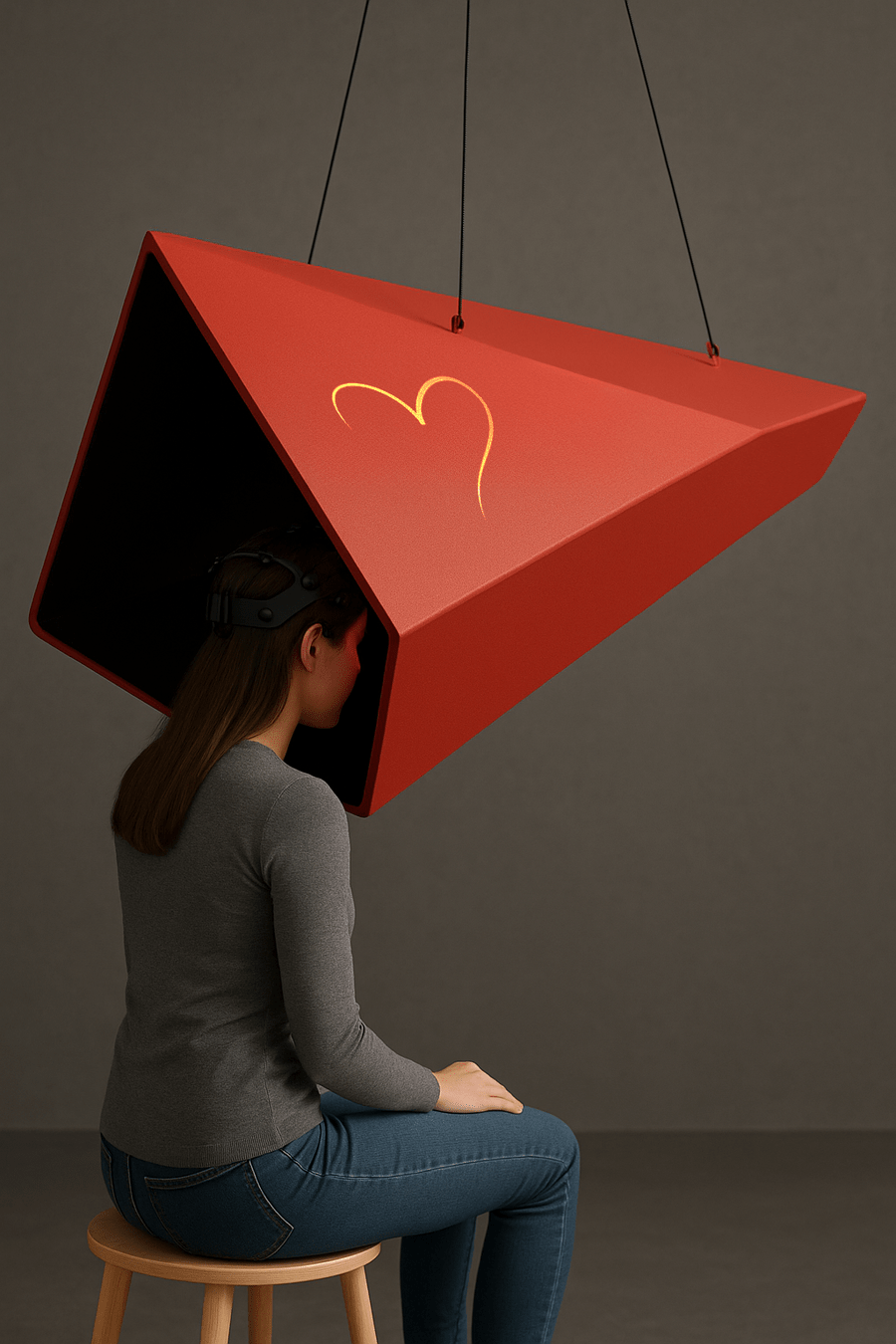 This concept presents an immersive piece designed as a suspended triangular kaleidoscope, a sculptural structure that blends art, emotional technology, and experiential design. Inspired by contemporary installations and sensorial cocoons, the unit allows each participant to enter an intimate, controlled environment where image, sound, and neuro-interaction come together.