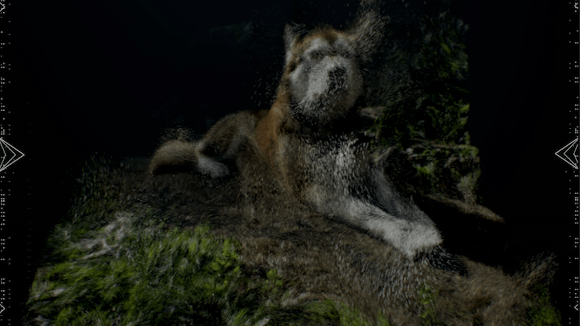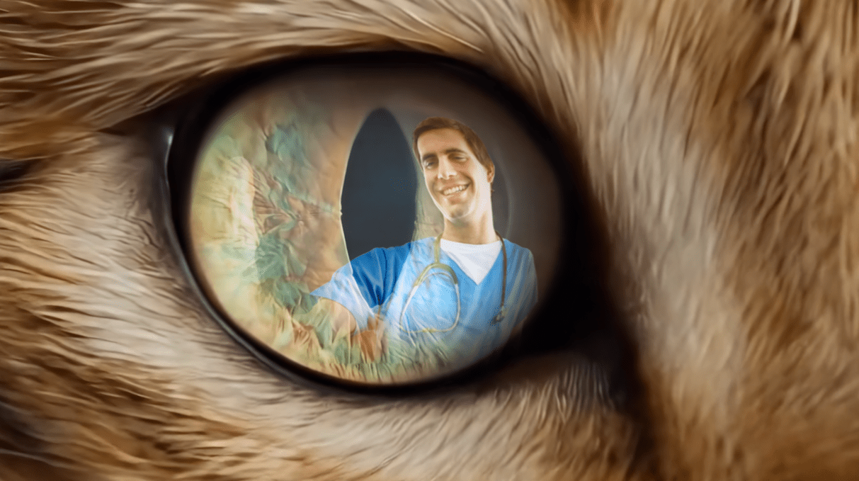 From that base state, the selected content is activated. An initial image: the pet's eye, also reflecting the vet. The virtual camera dives into the retina and takes us into its inner world: a dreamy, liquid and beautifully painted space where the pet's memories live.