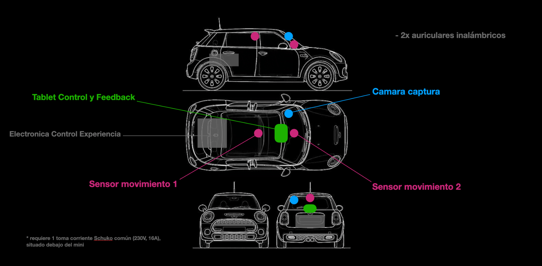 3. Interacción: Se les invita a tocar distintas zonas del coche. Cada zona = un sample musical distinto. Sensores con IA detectan posición y contacto de manos. Cada toque dispara clips en Ableton Live.